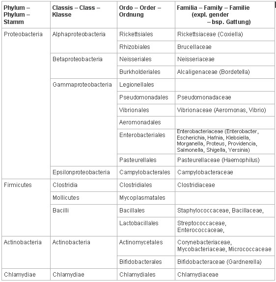 The currently valid system of bacteria in a phylogenetic frame is: Garrity, G. M.; J. A. Bell und T. G. Lilburn: "Taxonomic Outline of the Prokaryotes. Bergey's Manual of Systematic Bacteriology", Second Edition, Release 5.0, Springer-Verlag, New York, 2004 (Source/Quelle: Wikipedia)